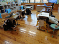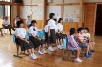 入野海岸から一番近くにある避難タワーの最上階まで、小走りで避難する練習もしました。タイマーで計測したところ約8分かかりました。避難タワーにどのような設備があるか教えていただいたり、新聞を使って一人分のスペースを確認したりしました。こうすることによって、災害時に人と人の間隔がどのくらいになるかイメージすることができました。